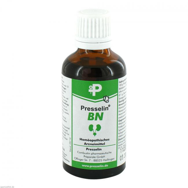 Presselin BN Tropfen zum Einnehmen. Anwendungsgebiete: Homöopathisches Arzneimittel, daher ohne Angabe einer therapeutischen Indikation. Warnhinweis: Enthält 62 Vol.-% Alkohol!