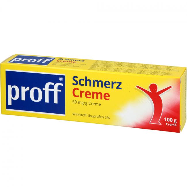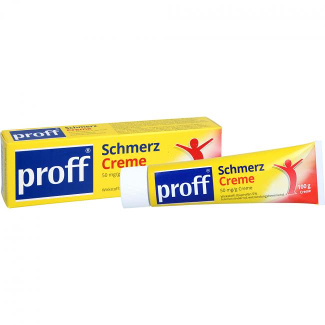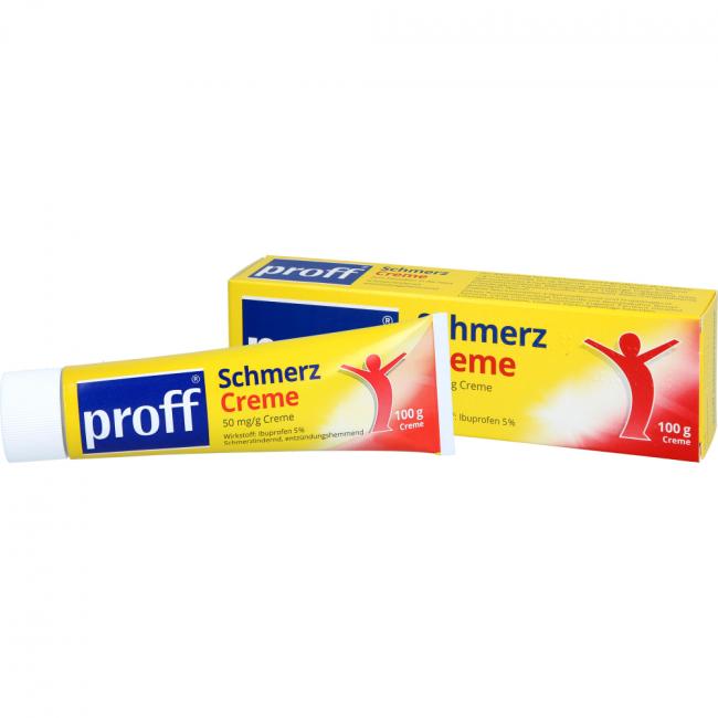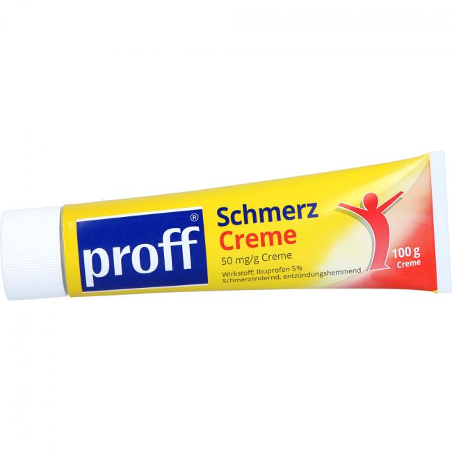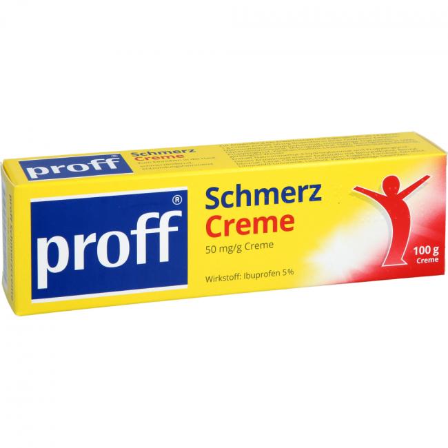 proff Schmerzcreme 50 mg/g Creme. Wirkstoff: Ibuprofen. Anwendungsgebiete: zur äußerlichen oder unterstützenden Behandlung bei Muskelrheumatismus, degenerativen schmerzhaften Gelenkerkrankungen (Arthrosen), entzündlichen rheumatischen Erkrankungen der Gelenke und der Wirbelsäule, Schwellung bzw. Entzündung der gelenknahen Weichteile (z. B. Schleimbeutel, Sehnen, Sehnenscheiden, Bänder und Gelenkkapsel), Schultersteife, Kreuzschmerzen, Hexenschuss, Sport- und Unfallverletzungen wie Prellungen, Verstauchungen, Zerrungen.