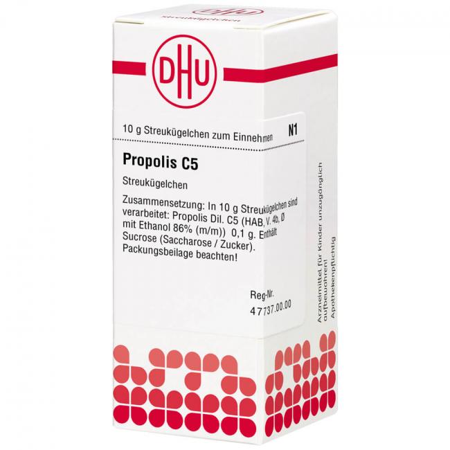 Propolis C 5. Anwendungsgebiete: Registriertes homöopathisches Arzneimittel, daher ohne Angabe einer therapeutischen Indikation. Warnhinweis: Dieses Arzneimittel enthält Sucrose (Saccharose / Zucker).