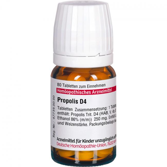 Propolis D 4. Anwendungsgebiete: Registriertes homöopathisches Arzneimittel daher ohne Angabe einer therapeutischen Indikation. Warnhinweis: Enthält Lactose (Milchzucker) und Weizenstärke.