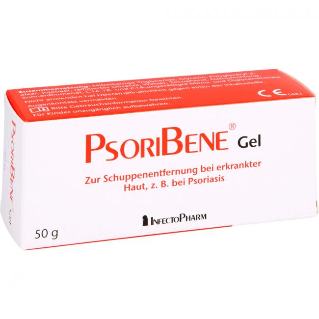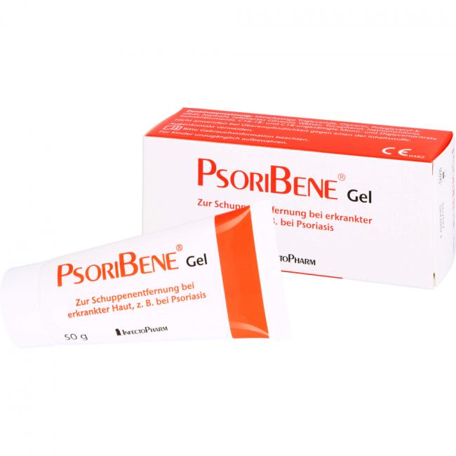 Psoribene Gel wird angewendet zur Schuppenentfernung bei erkrankter Haut, z.B. bei Psoriasis. Es handelt sich um ein schuppenlösendes Oleogel (Ölgel) zur topischen Behandlung vermehrter Hautschuppen und Plaques bei Psoriasis (Schuppenflechte) an Kopfhaut und Körper. Durch das Oleogel werden zunächst die Schuppen gelöst. Durch Zugabe von Wasser entsteht eine milchig-trübe, wasserlösliche Emulsion, in der sich die in Öl gelösten Schuppen mit Wasser verbinden. Die entstandene Emulsion lässt sich einfach mit lauwarmem Wasser abspülen.
