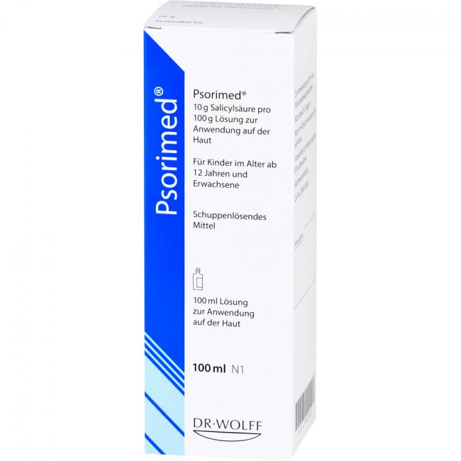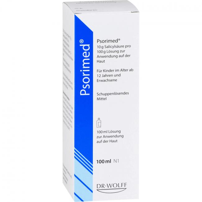 Psorimed. Wirkstoff: Salicylsäure. Anwendungsgebiete: für die initiale Behandlung von leichter bis mittelschwerer Psoriasis der Kopfhaut.