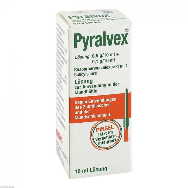 Pyralvex Lösung 0,5 g/10 ml + 0,1 g/10 ml. Anwendungsgebiete: zur zeitweiligen Behandlung von schmerzhaften, entzündlichen Zuständen der Mundschleimhaut, insbesondere bei Ausschlag der Lippen und der Mundschleimhaut in Form von gelblich weißen Flecken (Aphthen) und zur zeitweiligen, unterstützenden, symptomatischen Behandlung von Zahnfleischentzündungen (Gingivitis). Warnhinweis: Enthält 59,5 Vol.-% Alkohol!