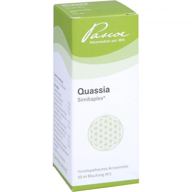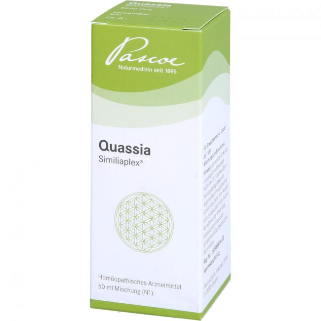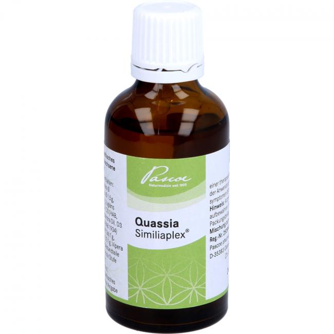 Quassia Similiaplex Mischung. Anwendungsgebiete: Registriertes homöopathisches Arzneimittel, daher ohne Angabe einer therapeutischen Indikation. Warnhinweis: Enthält 54 Vol.-% Alkohol!