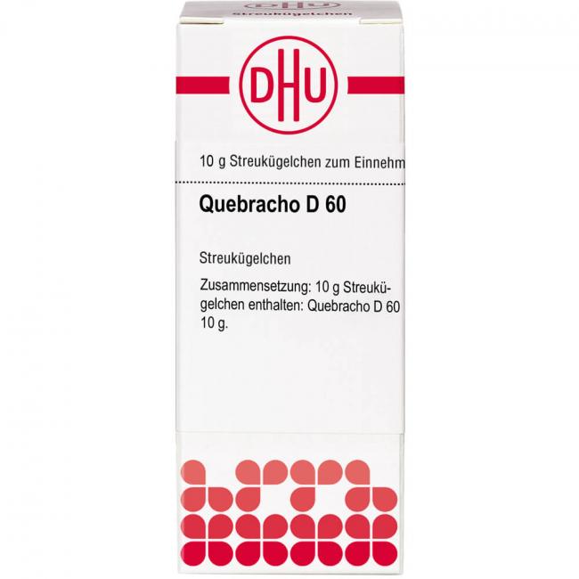 Quebracho D 60. Anwendungsgebiete: Registriertes homöopathisches Arzneimittel, daher ohne Angabe einer therapeutischen Indikation. Warnhinweis: Dieses Arzneimittel enthält Sucrose (Saccharose / Zucker).