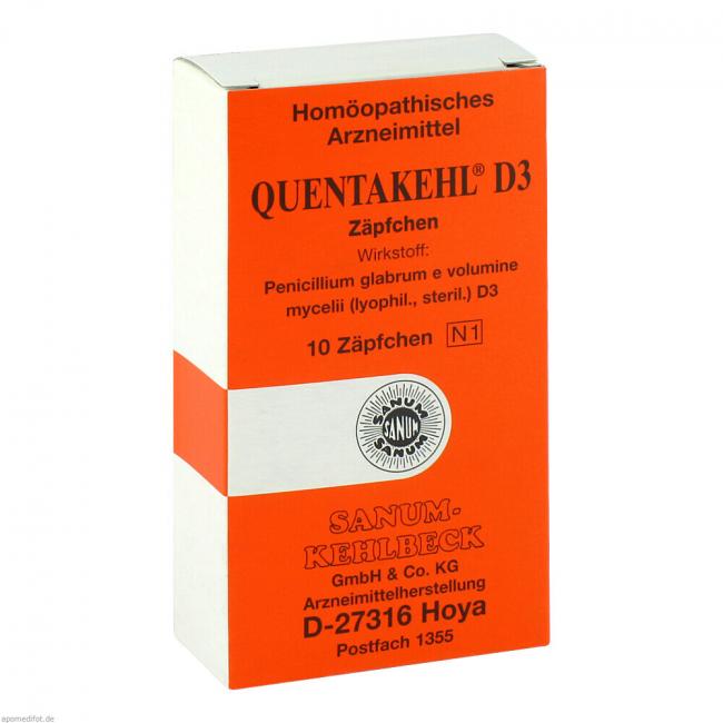 Quentakehl D3 Zäpfchen. Wirkstoff: Pénicillium glabrum e volumine mycelii (lyophil., steril.) D3. Anwendungsgebiete: Registriertes homöopathisches Arzneimittel, daher ohne Angabe einer therapeutischen Indikation.
