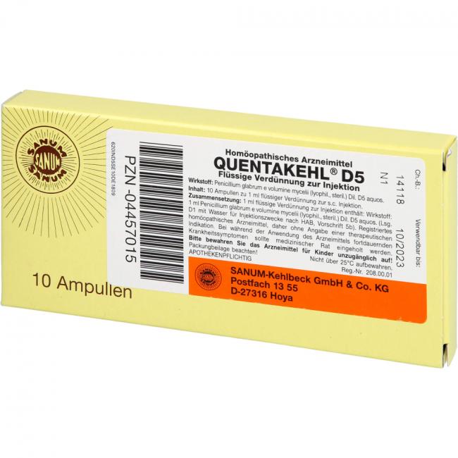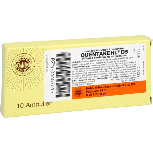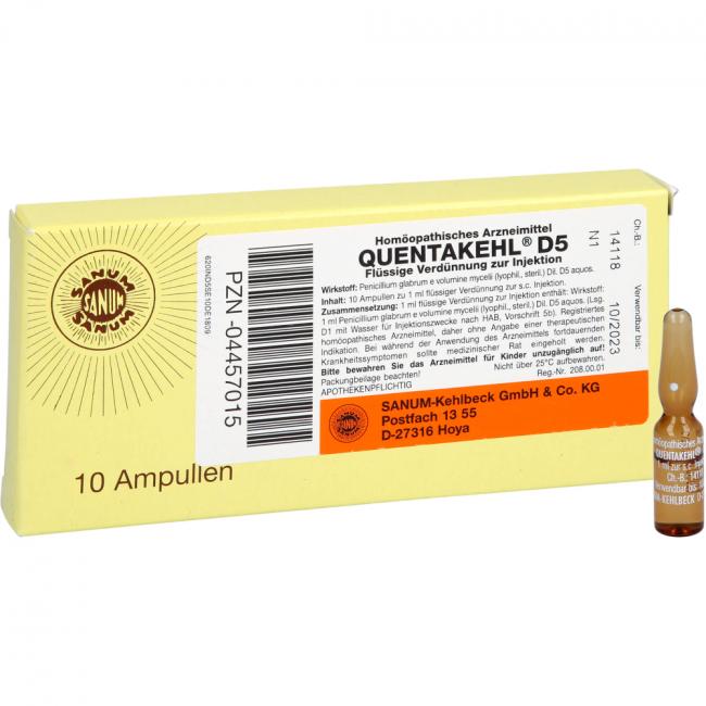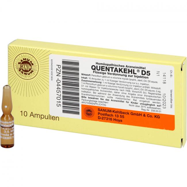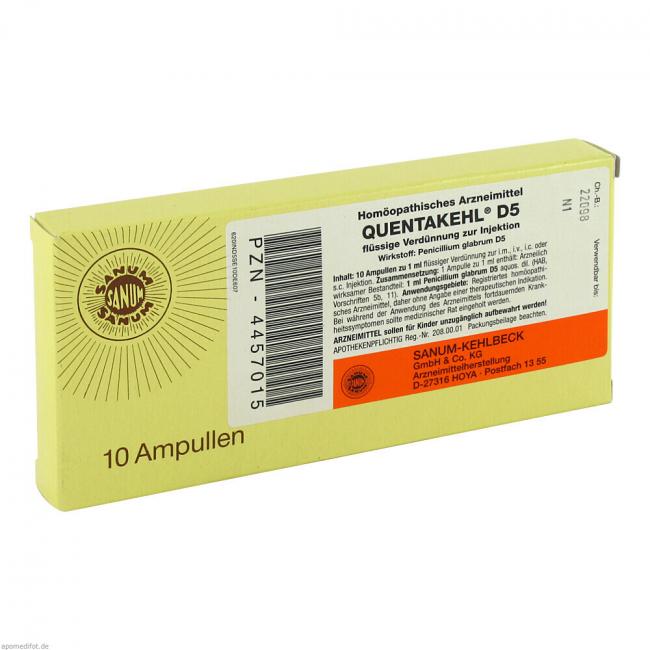 Quentakehl D5 Flüssige Verdünnung zur Injektion. Wirkstoff: Penicillium glabrum e volumine mycelii (lyophil., steril.) Dil. D5 aquos. Anwendungsgebiete: Registriertes homöopathisches Arzneimittel, daher ohne Angabe einer therapeutischen Indikation.