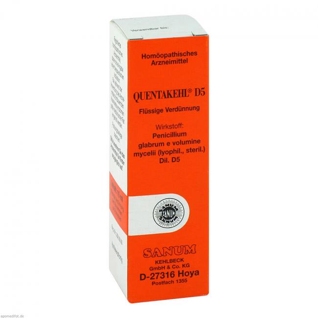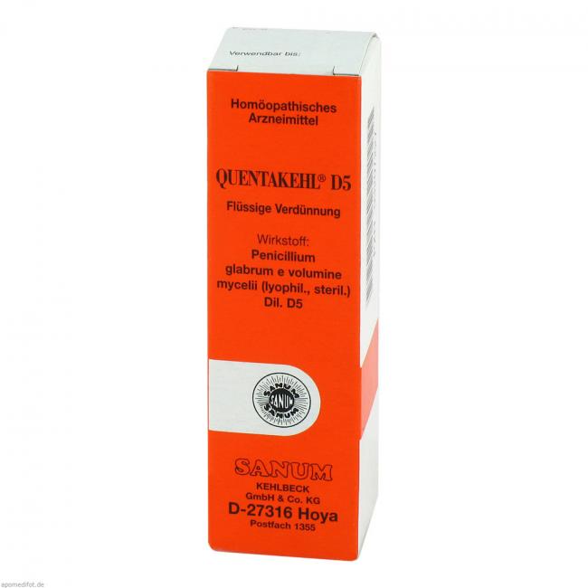 Quentakehl D5, Flüssige Verdünnung. Wirkstoff: Penicillium glabrum e volumine mycelii (lyophil., steriL) Dil. D5. Anwendungsgebiete: Registriertes homöopathisches Arzneimittel, daher ohne Angabe einer therapeutischen Indikation.