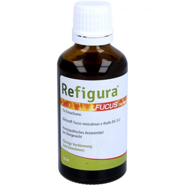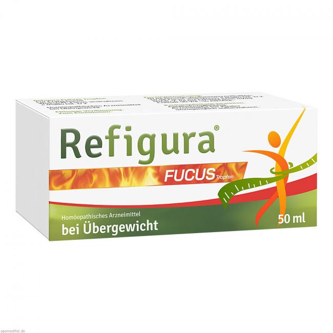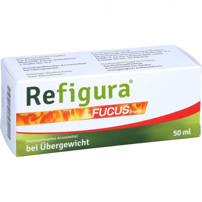 Refigura Fucus Tropfen. Wirkstoff: Fucus vesiculosus e thallo Dil. D2. Anwendungsgebiete: Refigura Fucus Tropfen wird angewendet entsprechend dem homöopathischen Arzneimittelbild. Dazu gehört: Übergewicht. Warnhinweis: Enthält 90 Vol.-% Alkohol!