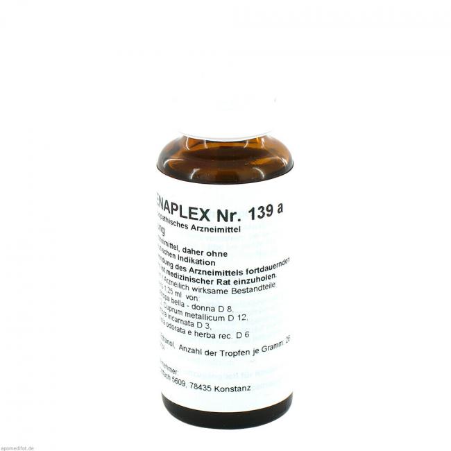 REGENAPLEX Nr.139 a. Anwendungsgebiete: Registriertes homöopathisches Arzneimittel, daher ohne Angabe einer therapeutischen Indikation. Warnhinweis: Enthält 50 Vol.-% Alkohol.