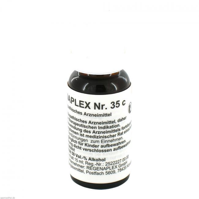Regenaplex Nr. 35c, Mischung. Anwendungsgebiete: Registriertes homöopathisches Arzneimittel, daher ohne Angabe einer therapeutischen Indikation. Warnhinweis: Enthält 50 Vol.-% Alkohol!