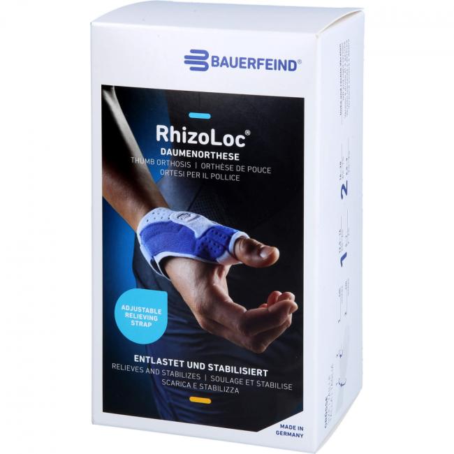 Skidaumen oder andere Verletzungen der Daumengelenke, Arthrose oder Reizzustände im Gelenk, postoperative Versorgung: Damit sich der überdehnte Band- und Kapselapparat schneller wieder regeneriert, braucht das Gelenk Stabilität. Denn wir beanspruchen unsere Daumen mehr, als uns bewusst ist. RhizoLoc schafft Abhilfe und gibt dem Daumen zuverlässigen Halt, um Schmerzen zu lindern und die Heilung und Mobilisierung zu fördern. Die RhizoLoc schient den Daumen am Sattel- und Grundgelenk mit einem individuell anformbaren Aluminiumbügel. So können sich die betroffenen Seitenbänder optimal regenerieren. Mittels einer speziellen Klettlasche kann die Bewegungseinschränkung fest oder locker eingestellt werden, wie es die Therapie erfordert. Das atmungsaktive Material mit eingearbeiteten Poren lässt Luft an deine Haut, was das Tragen angenehm macht und Schwitzen vorbeugt. Dank praktischem Klettverschluss lässt sich die Orthese mit der anderen Hand leicht an- und ablegen. Damit ermöglicht sie eine frühe Aufnahme des Gesundheitstrainings, damit der Daumen schnell wieder beweglich wird.