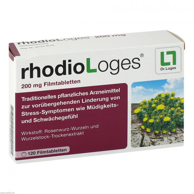 rhodioLoges 200 mg Filmtabletten. Wirkstoff: Rosenwurzwurzelstock-Trockenextrakt. Anwendungsgebiete: traditionelles pflanzliches Arzneimittel zur vorübergehenden Linderung von Stress-Symptomen wie Müdigkeits- und Schwächegefühl bei Erwachsenen.