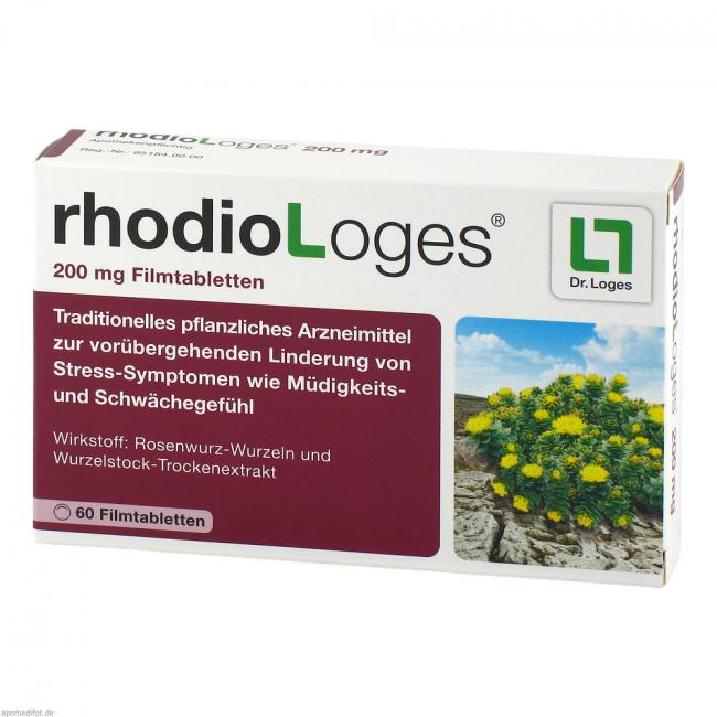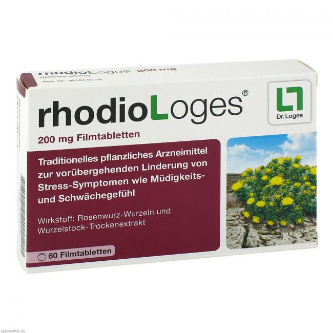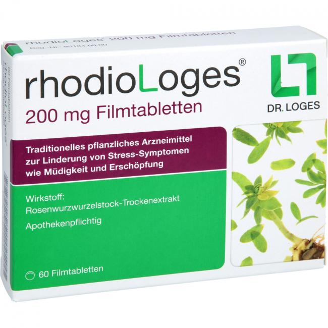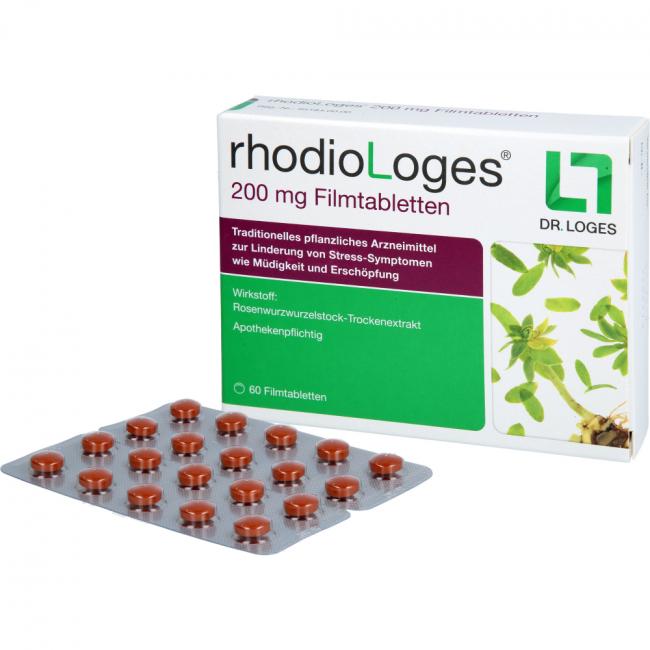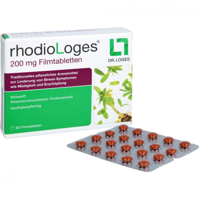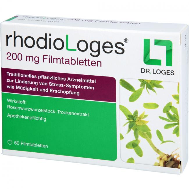 rhodioLoges 200 mg Filmtabletten. Wirkstoff: Rosenwurzwurzelstock-Trockenextrakt. Anwendungsgebiete: traditionelles pflanzliches Arzneimittel zur vorübergehenden Linderung von Stress-Symptomen wie Müdigkeits- und Schwächegefühl bei Erwachsenen.