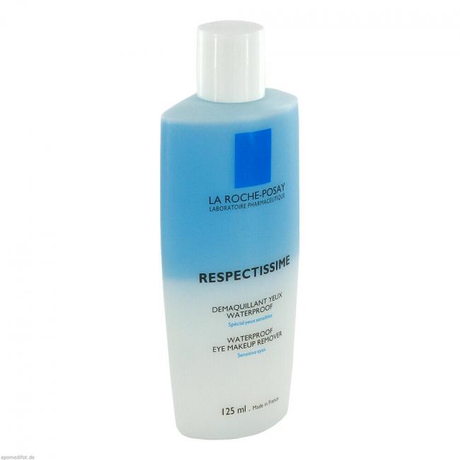 Der RESPECTISSIME AUGEN-MAKE-UP-ENTFERNER von La Roche-Posay entfernt wasserfestes Augen-Make-up sanft und gründlich. Der wasserfeste Make-up-Entferner ist durch seine schonende Formel besonders für empfindliche Augen und Kontaktlinsenträgerinnen geeignet. Der RESPECTISSIME AUGEN-MAKE-UP-ENTFERNER überzeugt durch seine duale Wirkung: In der ersten Phase der Anwendung wird wasserfester Mascara durch Fett gelöst. In der zweiten Phase entfernt der Wasseranteil des Produktes den restlichen Fettanteil und letzte Make-up-Partikel. Das Make-up lässt sich sanft und ohne Reiben entfernen, sensible Augen werden geschont. Durch seine wenigen, essentiellen und auf Allergien getesteten Inhaltsstoffe ist RESPECTISSIME von La Roche-Posay auch bei empfindlicher Haut und für jeden Hauttyp geeignet.