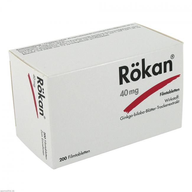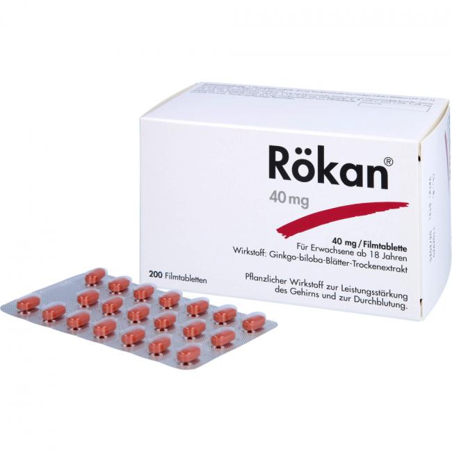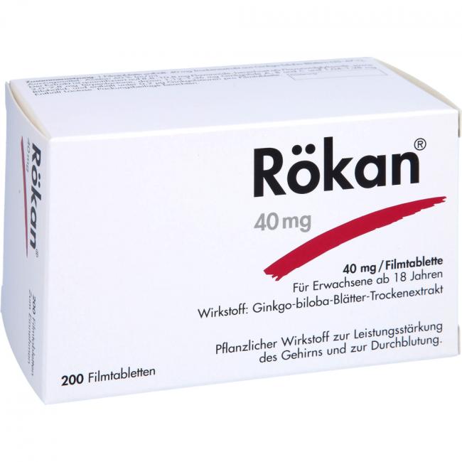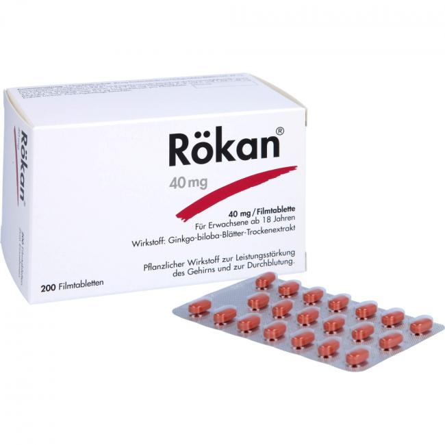 Rökan 40 mg Filmtabletten. Wirkstoff: Ginkgo-biloba-Blätter-Trockenextrakt. Anwendungsgebiete: Zur symptomatischen Behandlung von hirnorganisch bedingten geistigen Leistungseinbußen. Die Anwendung erfolgt im Rahmen eines therapeutischen Gesamtkonzeptes bei fortschreitender Abnahme bzw. Verlust erworbener geistiger Fähigkeiten (dementielles Syndrom) mit den Hauptbeschwerden: Gedächtnisstörungen, Konzentrationsstörungen, Niedergeschlagenheit, Schwindel, Ohrensausen, Kopfschmerzen. Warnhinweis: Enthält Lactose.