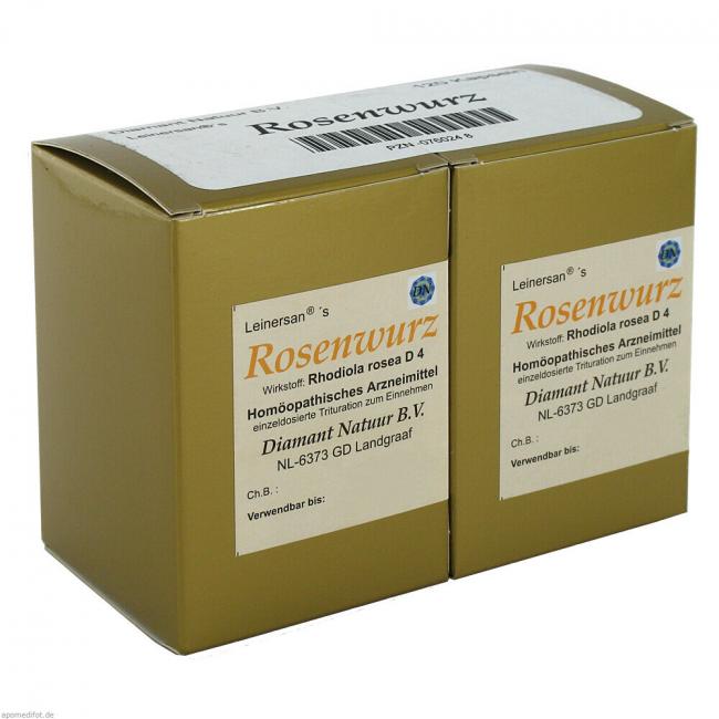 Leinersan's Rosenwurz, Kapseln. Wirkstoffe: Rhodiola Rosea D4. Anwendungsgebiete: Registriertes homöopathisches Arzneimittel, daher ohne Angabe einer therapeutischen Indikation.