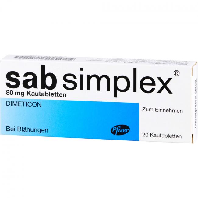 sab simplex 80 mg, Kautabletten. Wirkstoff: Dimeticon. Anwendungsgebiete: bei übermäßiger Gasbildung und Gasansammlung im Magen-Darm-Bereich (Blähungen [Meteorismus, Flatulenz], Schlucken von Luft [Aerophagie], Roemheld-Syndrom); vor diagnostischen Untersuchungen im Bauchbereich zur Reduzierung von Gasschatten im Röntgenbild; bei verstärkter Gasbildung nach Operationen.