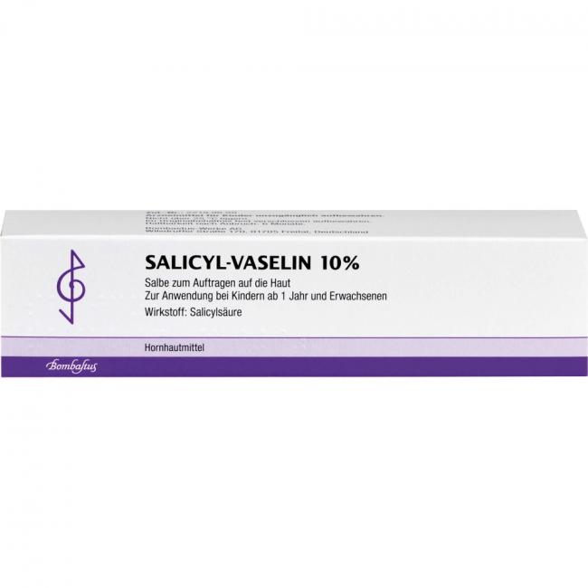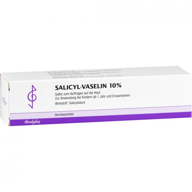 Salicyl-Vaselin 10%, Salbe. Wirkstoff: Salicylsäure. Anwendungsgebiete: wird äußerlich angewendet bei vermehrter Hornhautbildung (Hyperkeratosen), Hühneraugen (Clavus), Schwielen (Kallus).
