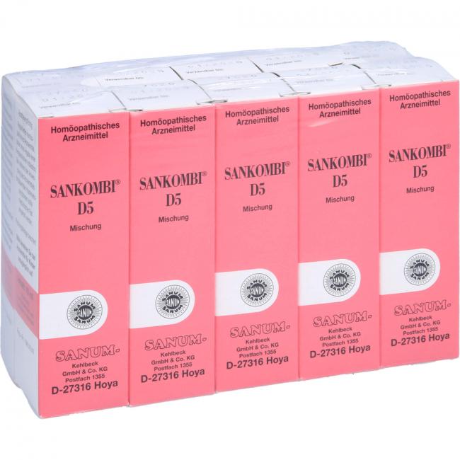 Sankombi D5, Mischung. Anwendungsgebiete: Registriertes homöopathisches Arzneimittel, daher ohne Angabe einer therapeutischen Indikation.