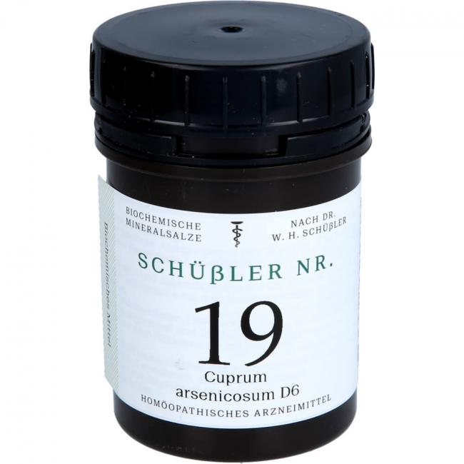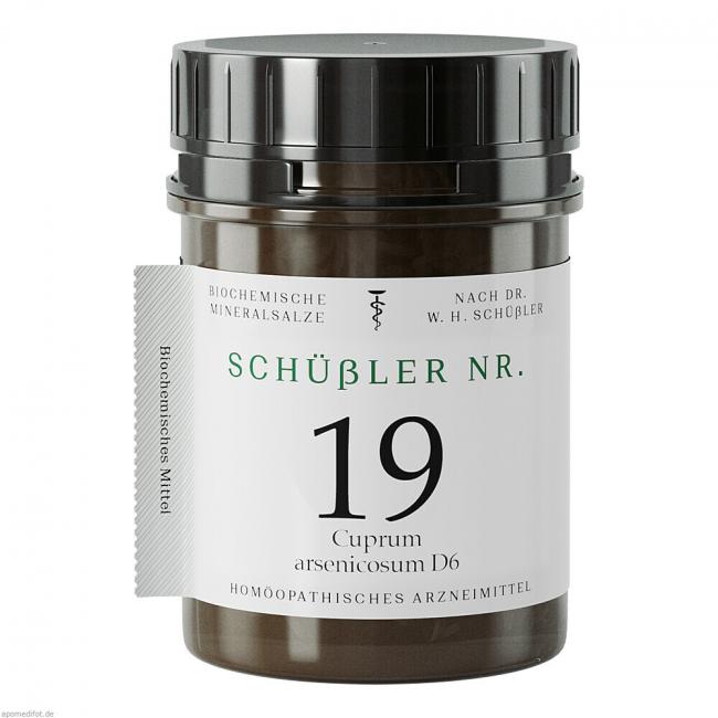 Schüssler Nr.19 Cuprum arsenicosum D 6 Tabletten. Anwendungsgebiete: Registriertes homöopathisches Arzneimittel, daher ohne Angabe einer therapeutischen Indikation.