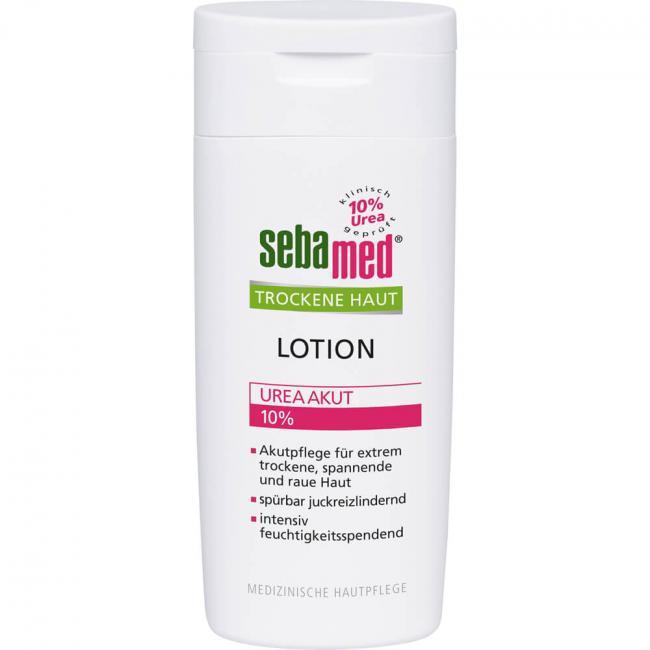 sebamed Trockene Haut 10% Urea Akut Lotion wurde als Spezialpflege für Personen mit besonders trockener Haut entwickelt. Ihre ausgesuchten Inhaltsstoffe lindern spürbar Spannungsgefühl, Rauheit und Juckreiz bei sehr trockener Haut und helfen, die natürliche Feuchtigkeitsbalance der Haut wieder herzustellen. Hochkonzentrierter Harnstoff (Urea) spendet intensiv Feuchtigkeit, lindert spürbar Juckreiz und hilft, sehr trockene Haut zu glätten. Ein Hydro-Lipid-Komplex aus natürlichem Süßmandelöl und Polyol pflegt die Haut geschmeidig und fördert den Schutz vor Austrocknung. Nachweisliche Verbesserung nach 2 Wochen: Reduzierung der Trockenheit der Haut um 86% (Quelle: Hautklinik der HSK-Kliniken Wiesbaden, 2008).