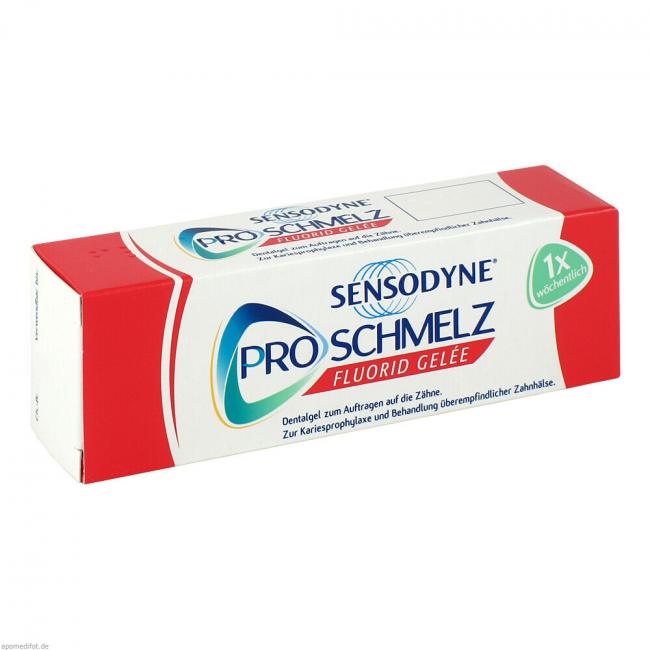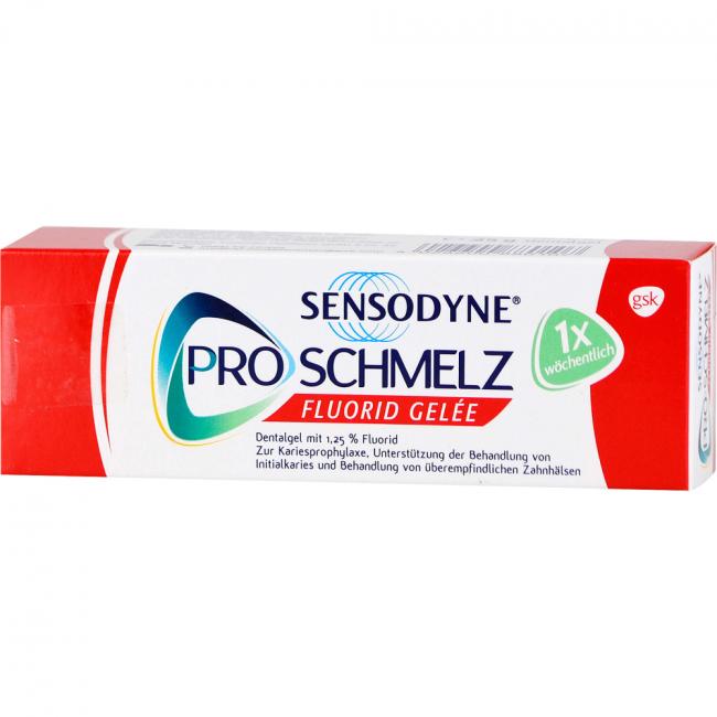 Sensodyne Proschmelz Fluorid Gelée. Wirkstoff: Natriumfluorid. Anwendungsgebiete: Vorbeugung der Karies, Unterstützung zur Behandlung der Initialkaries und Behandlung überempfindlicher Zahnhälse.