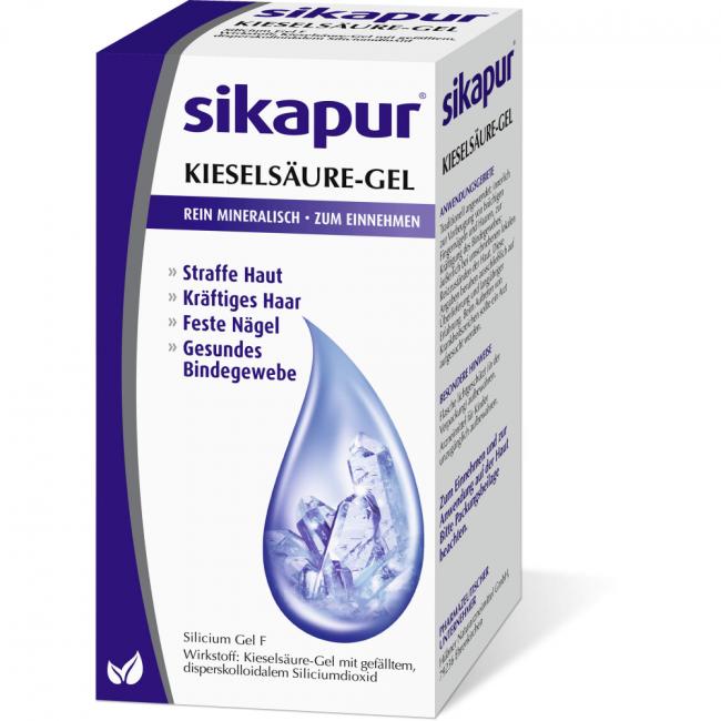 Silicium Gel F, sikapur Kieselsäure-Gel. Anwendungsgebiete: innerlich zur Vorbeugung von brüchigen Fingernägeln und Haaren, zur Kräftigung des Bindegewebes; äußerlich bei umschriebenen lokalen Reizzuständen der Haut.
