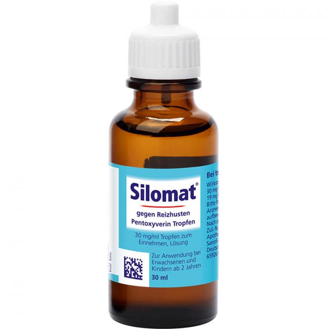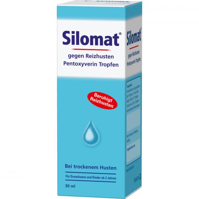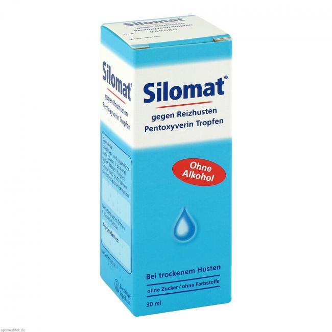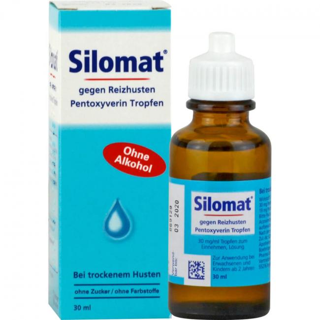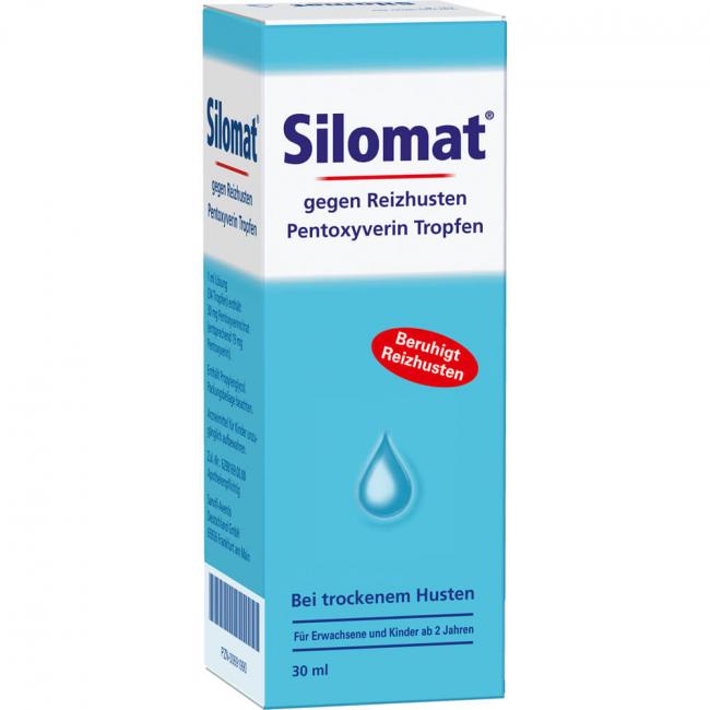 - Patienten, die trotz ärztlich verordneter Standardtherapie weiterhin unter einem trockenen asthmatischen Husten leiden,können auf Anraten des Arztes zusätzlich kurzfristig Silomat gegen Reizhusten Pentoxyverin Tropfen zur Symptomlinderung anwenden.