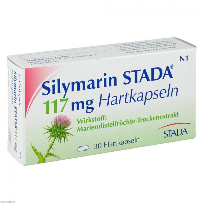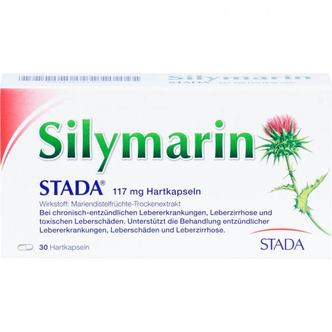 Silymarin Stada 117 mg Hartkapseln. Wirkstoff: Mariendistelfrüchte-Trockenextrakt. Anwendungsgebiete: zur unterstützenden Behandlung bei chronisch-entzündlichen Lebererkrankungen, Leberzirrhose und toxischen (durch Lebergifte verursachten) Leberschäden.