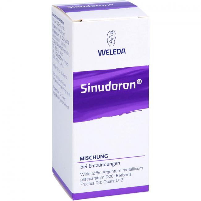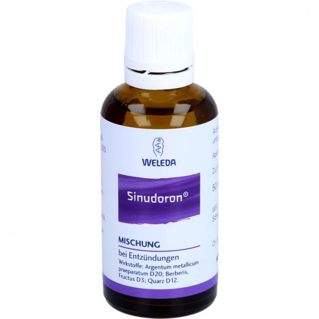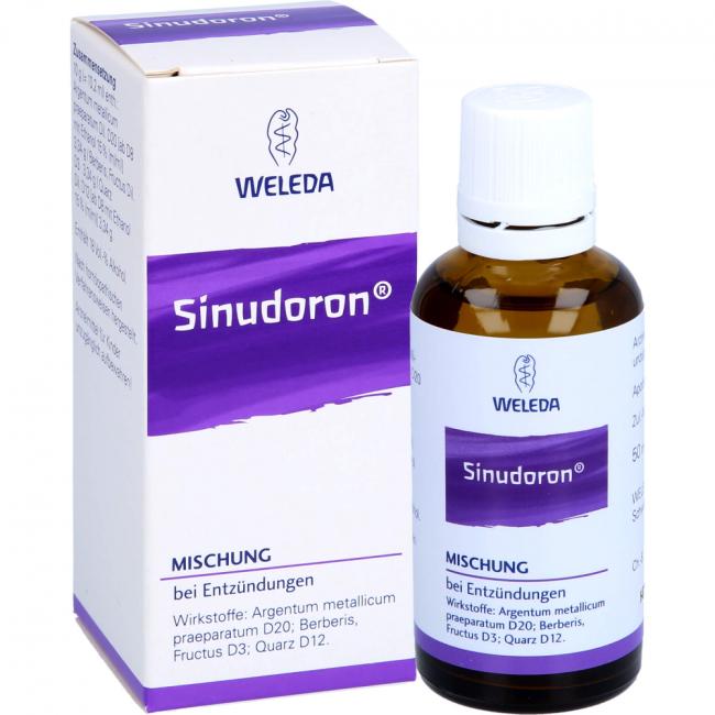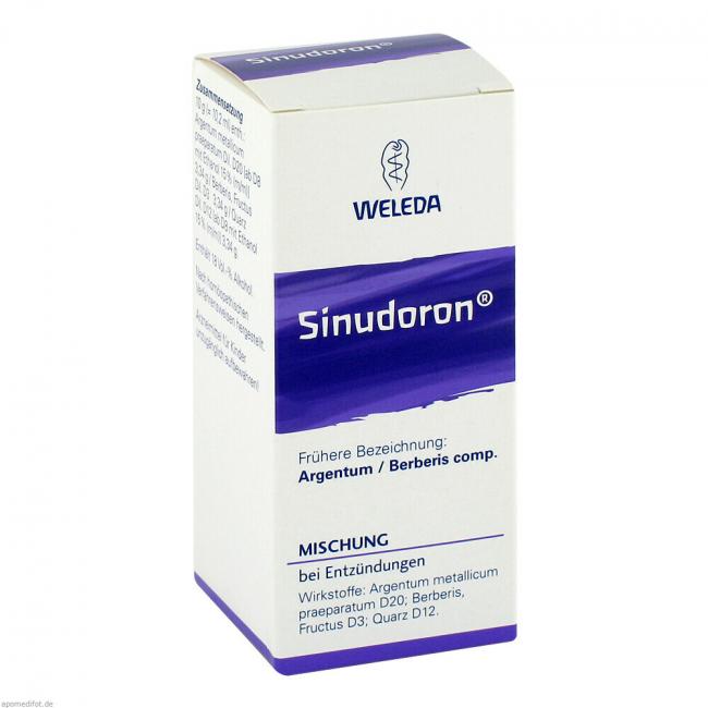 Sinudoron, Mischung. Anwendungsgebiete: Gemäß der anthroposophischen Menschen- und Naturerkenntnis gehören zu den Anwendungsgebieten: Harmonisierung des Zusammenwirkens von Empfindungs- und Lebensorganisation im aufbauenden Stoffwechsel, z.B. bei akuten und chronisch-rezidivierenden, eitrigen, fieberhaften Entzündungen der Schleimhäute des Nasen-Rachen-Raumes und der Nasennebenhöhlen.. Warnhinweis: Enthält 18 Vol.-% Alkohol!