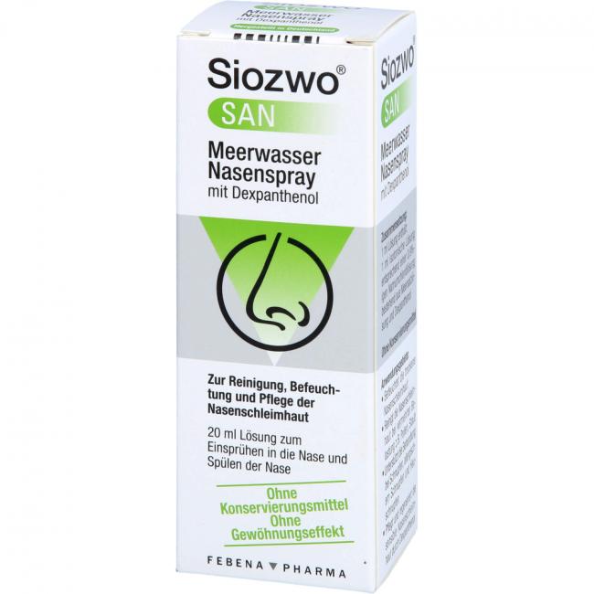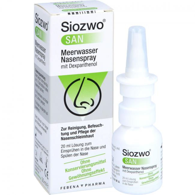 - Zur Befeuchtung der Nasenschleimhaut bei trockener Luft sowie in geheizten und klimatisierten Räumen oder auch im Flugzeug. Siozwo San Meerwasser Nasenspray mit Dexpanthenol beugt der sogenannten "Trockenen Nase" vor.
