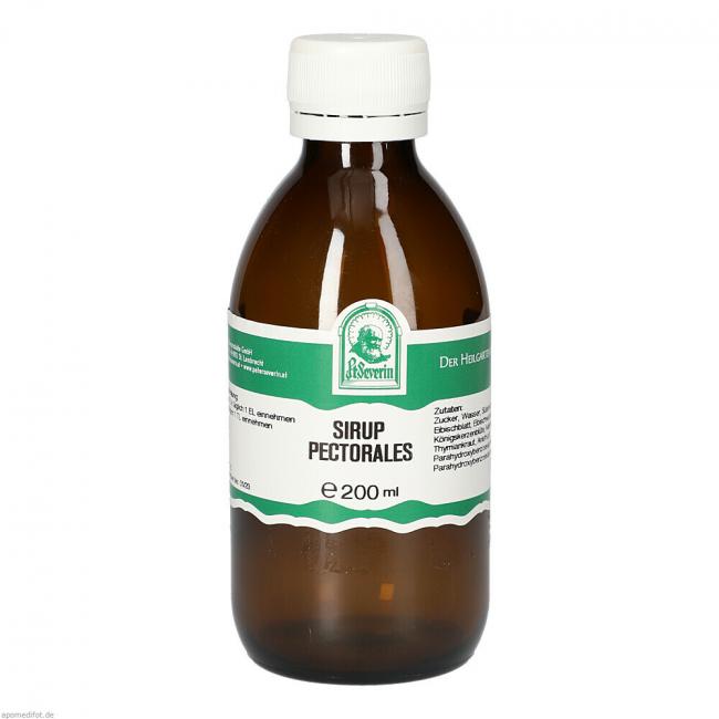 Zuckersirup (Saccharose, Wasser), Kräuterextrakt (Süßholzwurzel, Eibischblatt, Eibischwurzel, Königskerzenblüte, Malvenblüte, Thymiankraut, Anisfrucht); Konservierungsmittel: Parahydroxybenzoesäuremethyl und -propylester. Sirup Pectorales besteht aus einem Extrakt aus verschiedenen Kräutern, verkocht zu einem Sirup. Allergene: keine