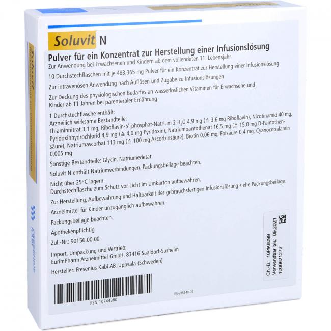 Soluvit N, Pulver für ein Konzentrat zur Herstellung einer Infusionslösung. Anwendungsgebiete: zur Deckung des Tagesbedarfs an den wasserlöslichen Vitaminen B1, B2, B6, B12, C, Pantothensäure, Biotin und Folsäure bei Erwachsenen und Kindern ab 11 Jahren im Rahmen einer parenteralen Ernährung.