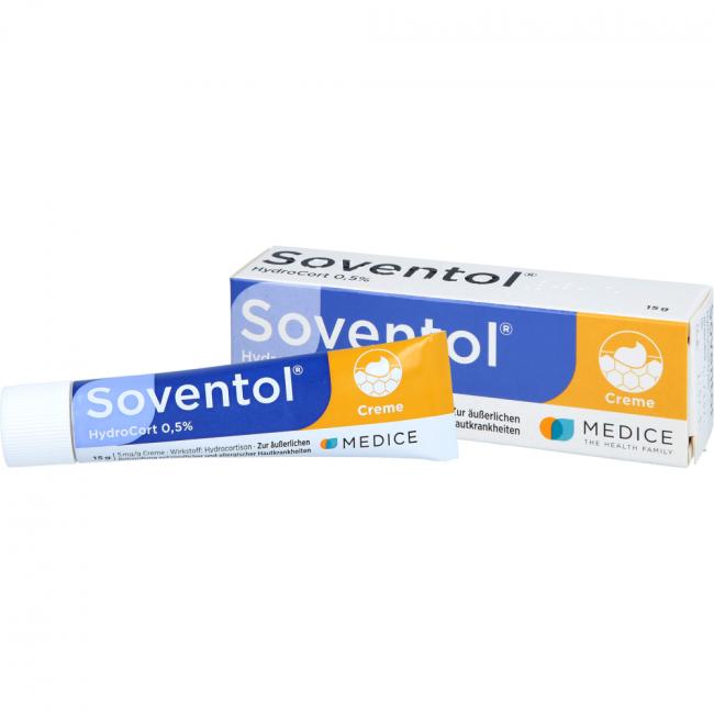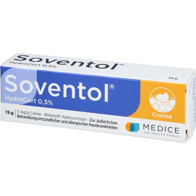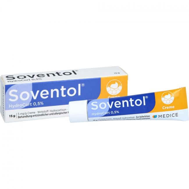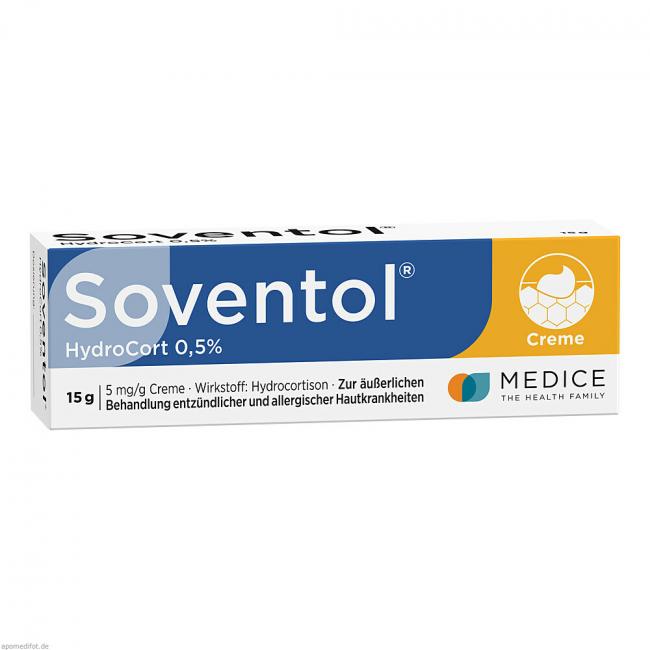 Soventol HydroCort 0,5% 5 mg/g Creme. Wirkstoff: Hydrocortison. Anwendungsgebiete: zur Behandlung von allen Hauterkrankungen, die auf eine Behandlung mit Corticoiden ansprechen, wie z.B. entzündliche, allergische oder juckende Dermatosen (Hautentzündungen, Ekzeme).