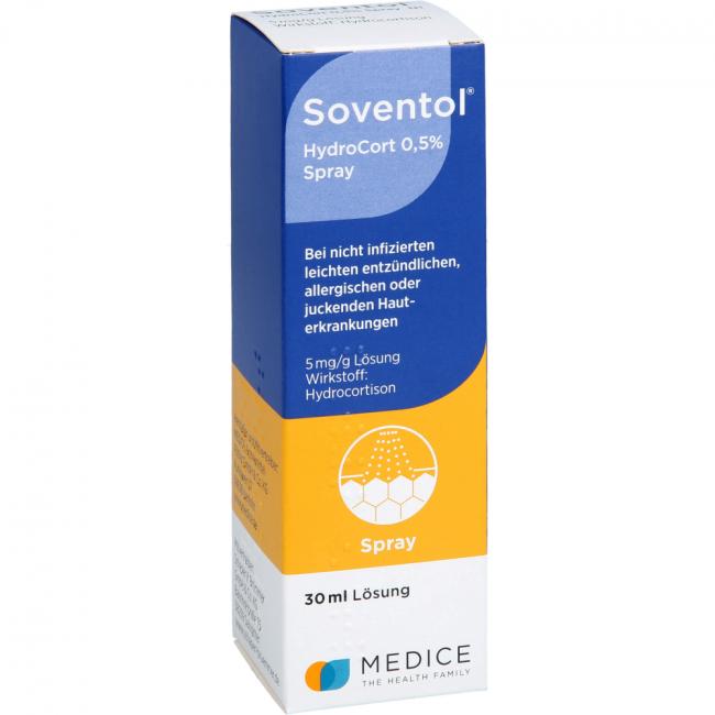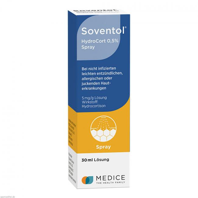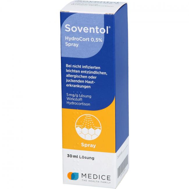 Soventol HydroCort 0,5% Spray ist ein Glucocorticoid (Nebennierenrindenhormon) für die Anwendung auf der Haut. Anwendungsgebiet: zur Linderung von nicht infizierten leichten entzündlichen, allergischen oder juckenden Hauterkrankungen, die auf eine symptomatische Behandlung mit schwach wirksamen Glucocorticosteroiden ansprechen. Soventol HydroCort 0,5% Spray eignet sich vorzugsweise zur Anwendung auf normaler oder fettiger Haut.