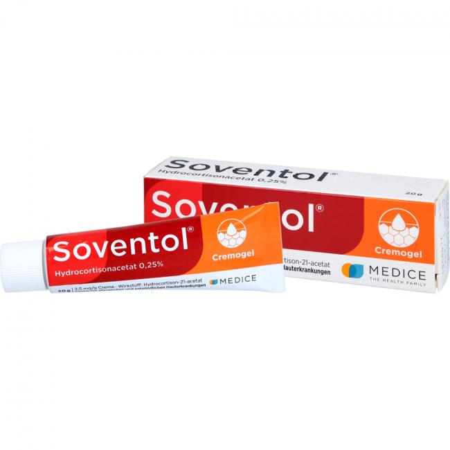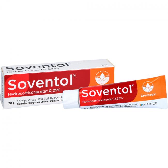 Soventol Hydrocortisonacetat 0,25% 2,5 mg/g Creme. Wirkstoff: Hydrocortison-21-Acetat. Anwendungsgebiete: zur Behandlung von entzündlichen und allergischen Dermatosen (Hautentzündungen und Ekzeme) mit geringer bis mittlerer Symptomausprägung, die auf eine äußerliche Behandlung mit schwach wirksamen Corticosteroiden ansprechen.
