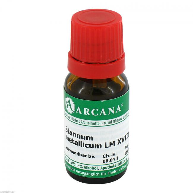 Stannum metallicum LM XVIII . Anwendungsgebiete: Registriertes homöopathisches Arzneimittel, daher ohne Angabe einer therapeutischen Indikation. Warnhinweis: Enthält 19 Vol.-% Alkohol.