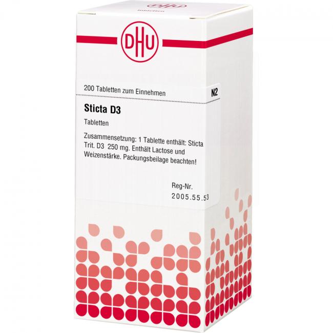 Sticta D 3. Anwendungsgebiete: Registriertes homöopathisches Arzneimittel daher ohne Angabe einer therapeutischen Indikation. Warnhinweis: Enthält Lactose (Milchzucker) und Weizenstärke.