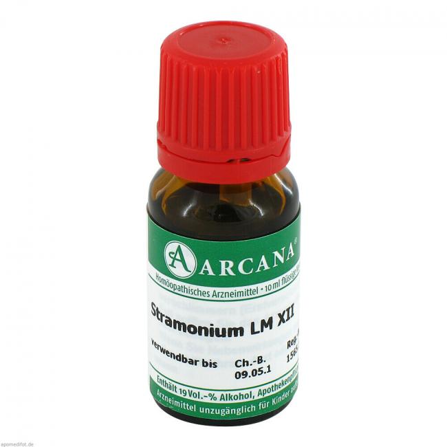 Stramonium LM XII . Anwendungsgebiete: Registriertes homöopathisches Arzneimittel, daher ohne Angabe einer therapeutischen Indikation. Warnhinweis: Enthält 19 Vol.-% Alkohol.