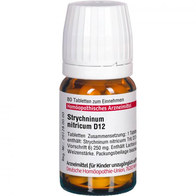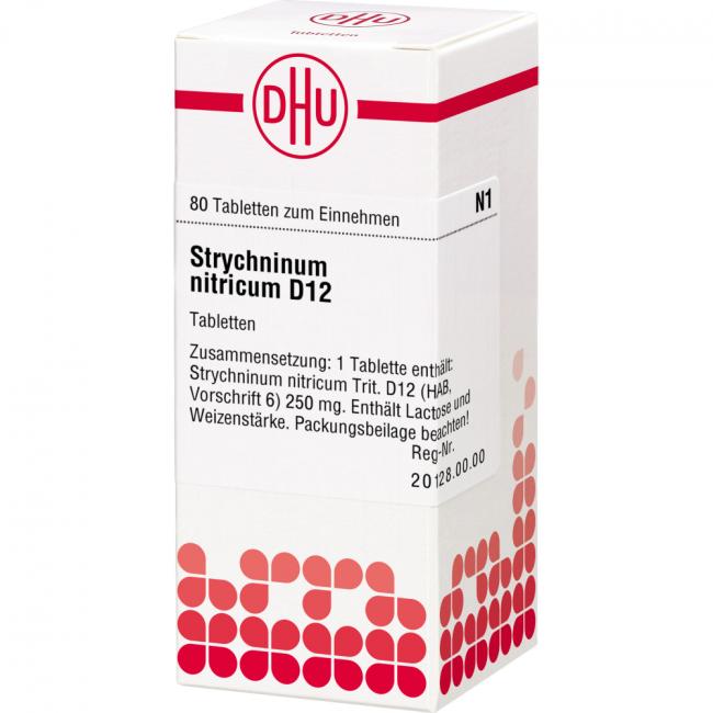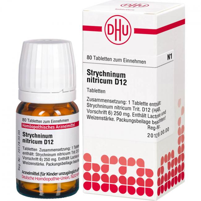 Strychninum Nitricum D 12. Anwendungsgebiete: Registriertes homöopathisches Arzneimittel daher ohne Angabe einer therapeutischen Indikation. Warnhinweis: Enthält Lactose (Milchzucker) und Weizenstärke.