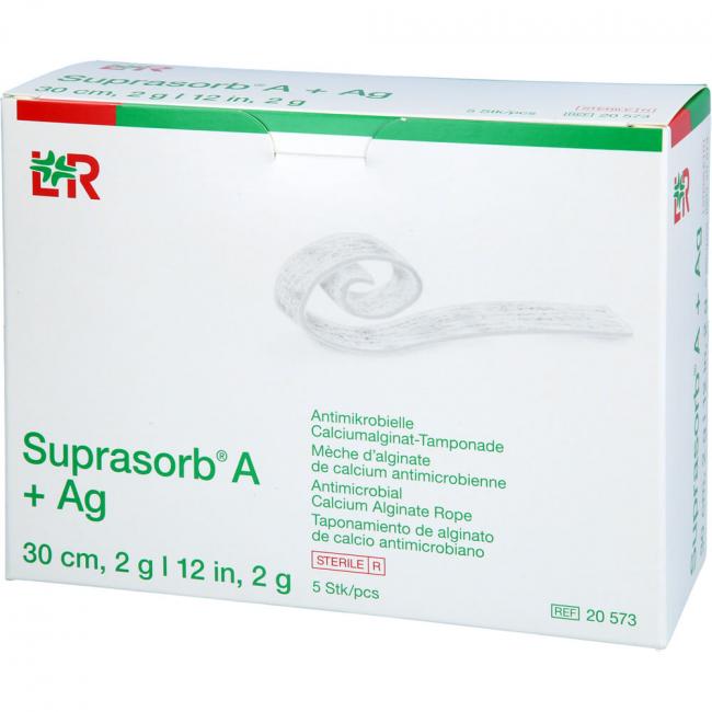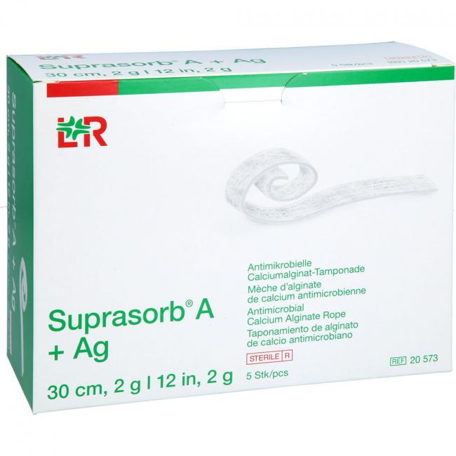Pflichtangaben SUPRASORB A+Ag Antimik.Cal.Alginat Tamp.30 cm 2 g, 5 Stück