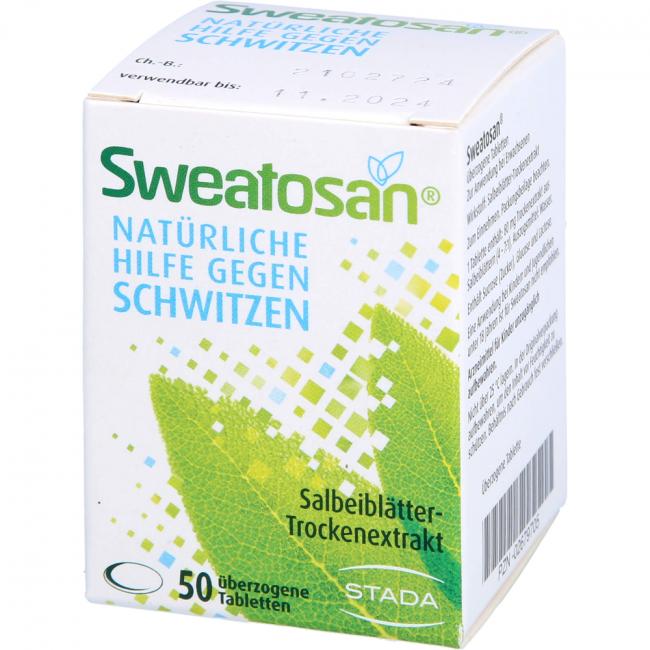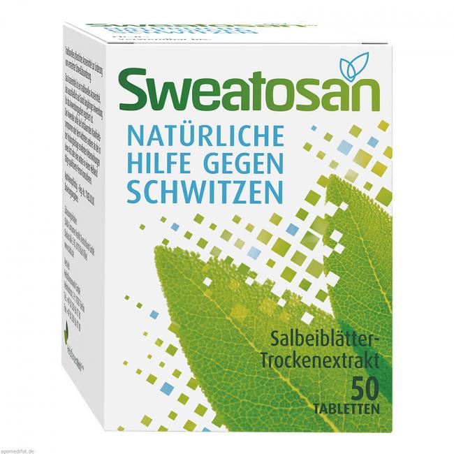 Sweatosan überzogene Tabletten. Wirkstoff: Salbeiblätter-Trockenextrakt. Anwendungsgebiete: traditionelles pflanzliches Arzneimittel zur Linderung von vermehrter Schweißabsonderung.