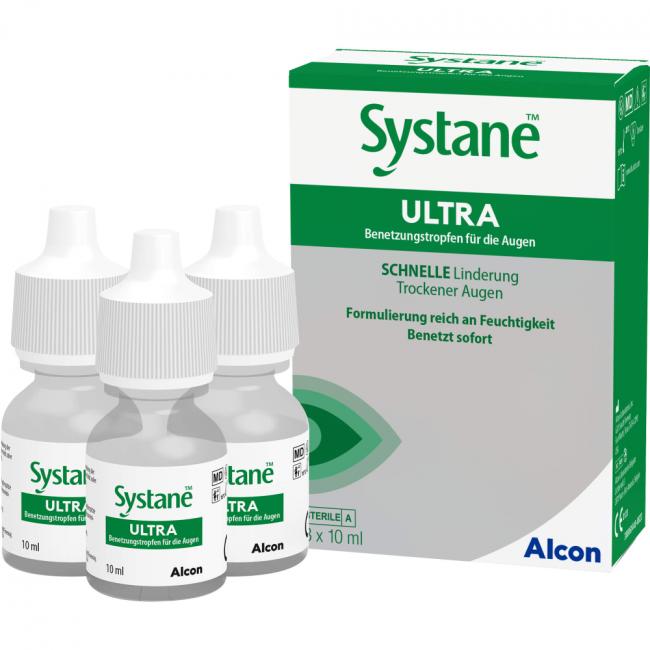 Systane Ultra sind Benetzungstropfen zur Therapie Trockener Augen. Systane Ultra Benetzungstropfen für die Augen lindern die Symptome des Trockenen Auges wie Brennen und Irritationen. Systane Ultra Benetzungstropfen für die Augen können zur Befeuchtung und Nachbenetzung von Kontaktlinsen verwendet werden. Sie sind geeignet für Silikon-Hydrogel-Kontaktlinsen und alle weichen (hydrophilen) Kontaktlinsen wie Tageslinsen, Monatslinsen und Dauertragelinsen. Systane Ultra Benetzungstropfen für die Augen befeuchten Ihre Kontaktlinsen, reduzieren Tragekomfortstörungen und helfen Irritationen zu vermeiden.