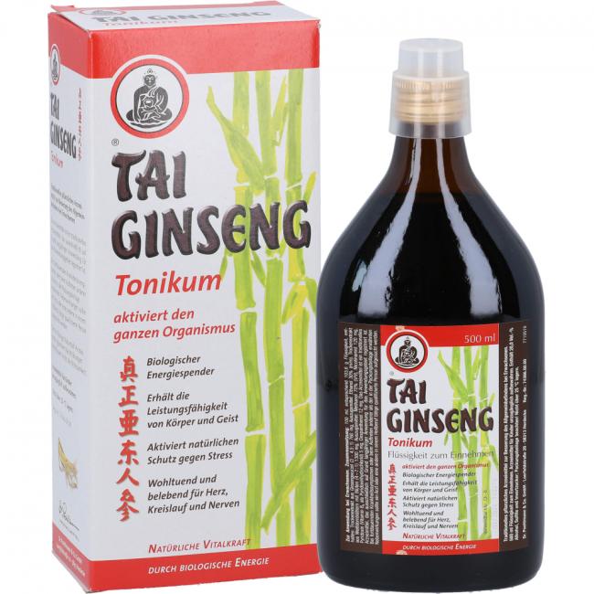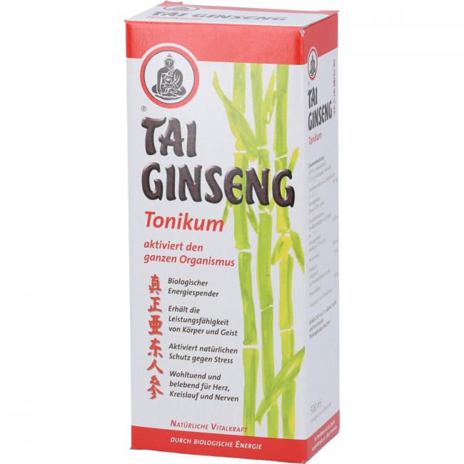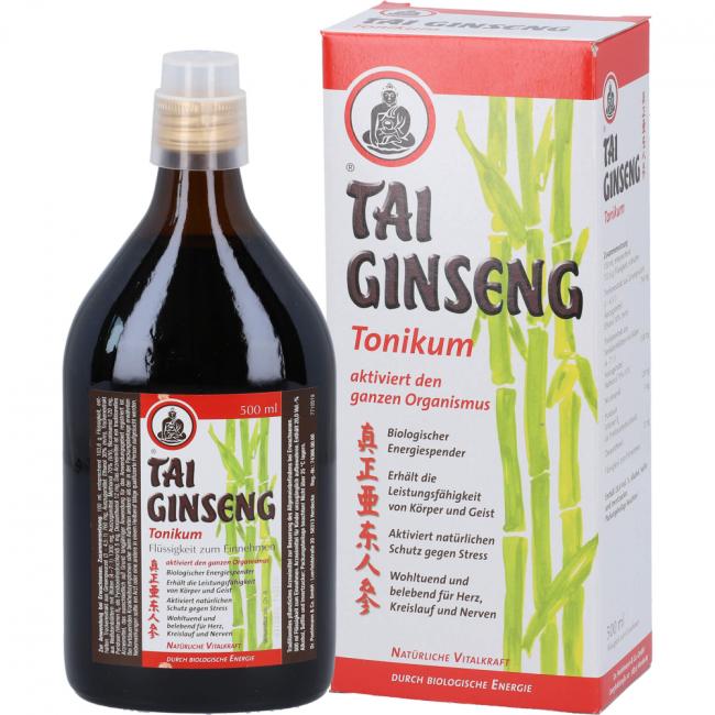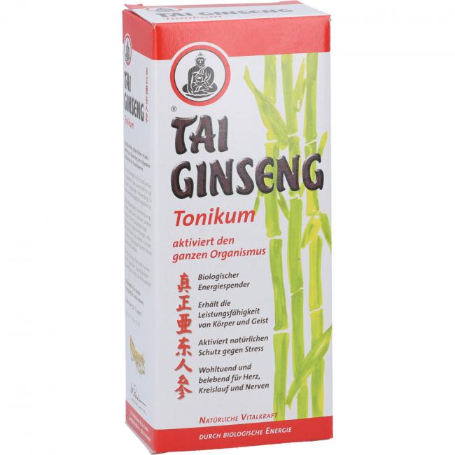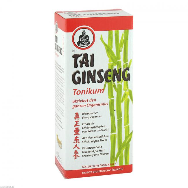 Tai Ginseng Tonikum, Flüssigkeit zum Einnehmen. Wirkstoffe: Ginsengwurzel- und Weißdornblätter-mit-Blüten-Trockenextrakt, Nicotinamid, Pyridoxin, Dexpanthenol. Anwendungsgebiete: zur Besserung des Allgemeinbefindens bei Erwachsenen. Warnhinweis: Enthält 20 Vol.-% Alkohol!