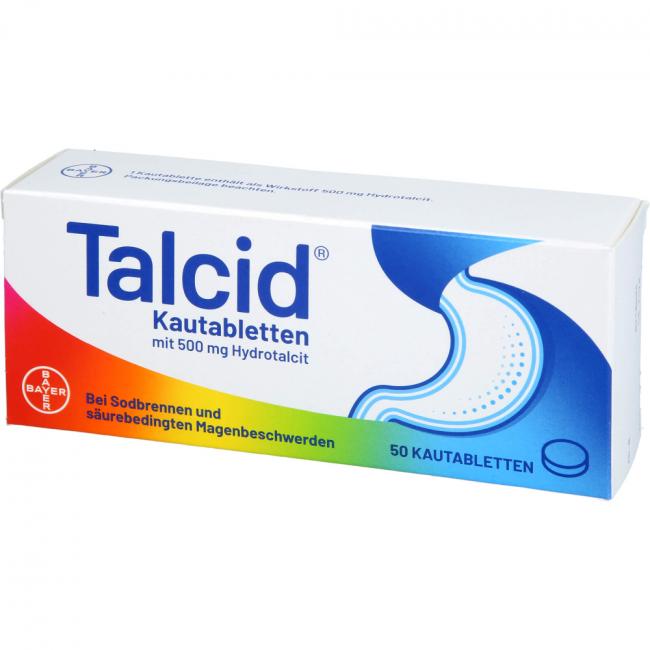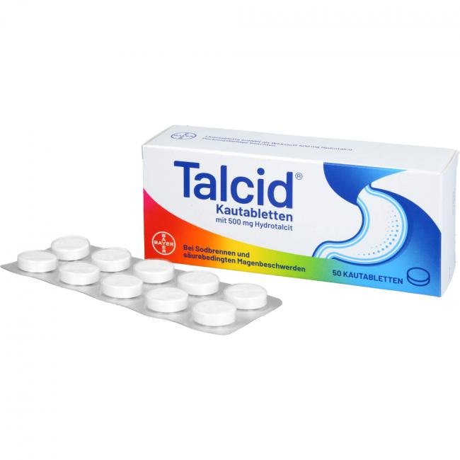 Talcid Kautabletten. Wirkstoff: Hydrotalcit. Anwendungsgebiete: zur symptomatischen Behandlung von Erkrankungen, bei denen die Magensäure gebunden werden soll: Magen- und Zwölffingerdarmgeschwüre (Ulcus ventriculi und Ulcus duodeni) und Sodbrennen und säurebedingte Magenbeschwerden.