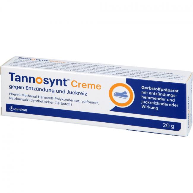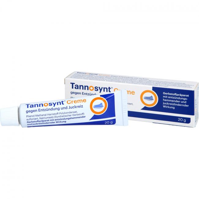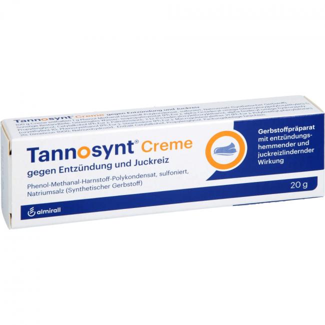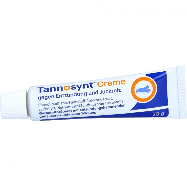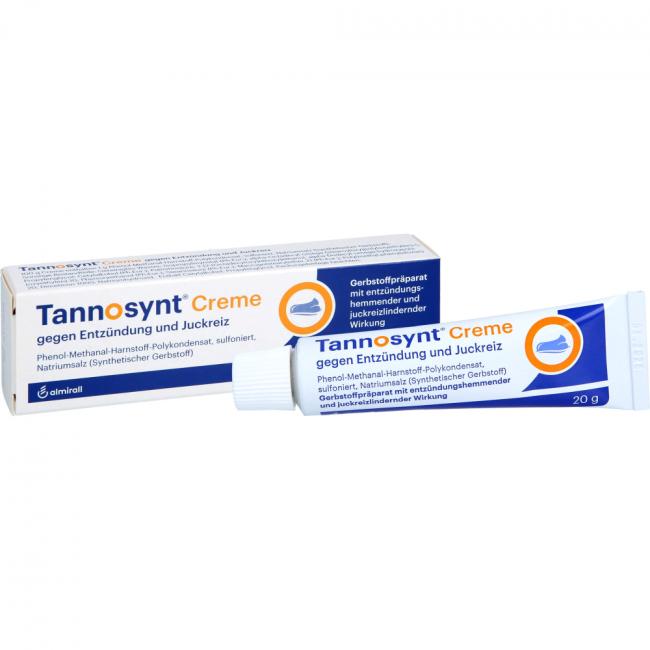 Tannosynt Creme gegen Entzündung und Juckreiz. Wirkstoff: Phenol-Methanal-Harnstoff-Polykondensat, sulfoniert, Natriumsalz (synthetischer Gerbstoff). Anwendungsgebiete: zur unterstützenden Behandlung von Hauterkrankungen, die mit Entzündung, Nässen und Juckreiz verbunden sind.