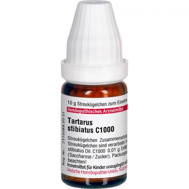 Tartarus stibiatus C 1000. Anwendungsgebiete: Registriertes homöopathisches Arzneimittel, daher ohne Angabe einer therapeutischen Indikation. Warnhinweis: Dieses Arzneimittel enthält Sucrose (Saccharose / Zucker).