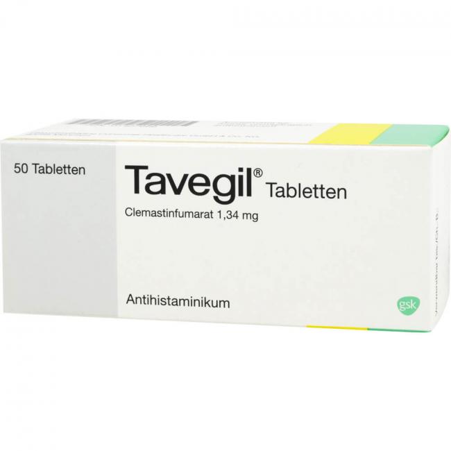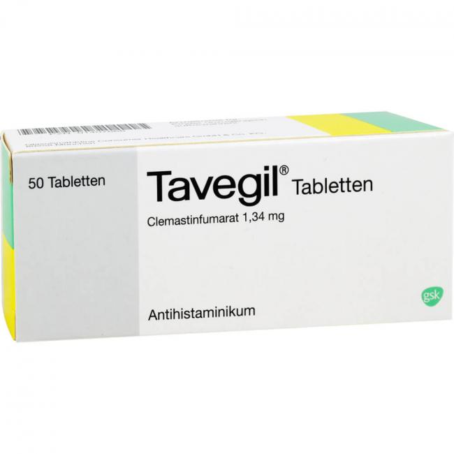 Tavegil Tabletten. Wirkstoff: Clemastinfumarat. Anwendungsgebiete: chronische idiopathische Urticaria (Nesselsucht ohne erkennbare Ursache) und symptomatische Linderung von allergischer Rhinitis (Heuschnupfen und ganzjährigem allergischem Schnupfen), wenn gleichzeitig eine Ruhigstellung angezeigt ist.