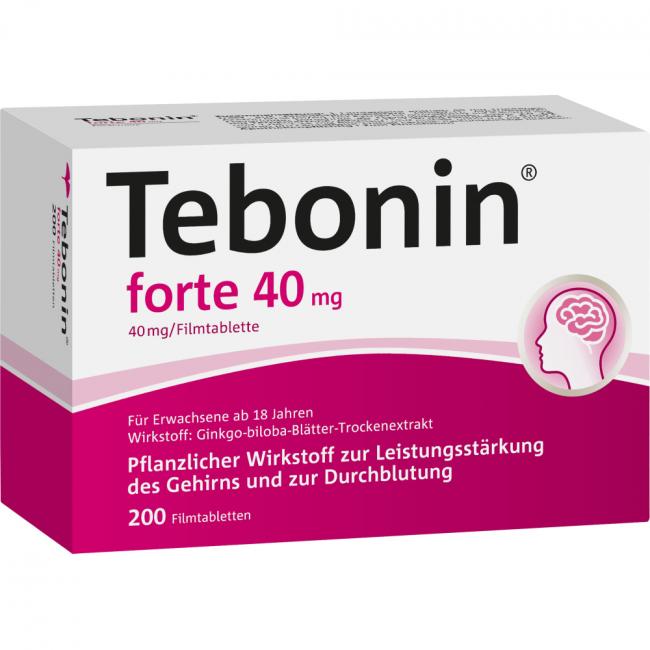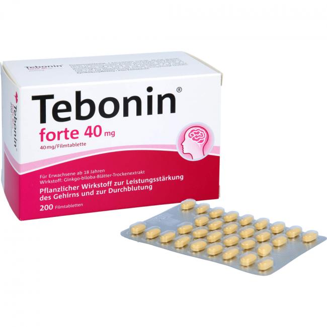 Tebonin forte 40 mg Filmtabletten. Wirkstoff: Ginkgo-biloba-Blätter-Trockenextrakt. Anwendungsgebiete: zur symptomatischen Behandlung von hirnorganisch bedingten geistigen Leistungseinbußen. Die Anwendung erfolgt im Rahmen eines therapeutischen Gesamtkonzeptes bei fortschreitender Abnahme bzw. Verlust erworbener geistiger Fähigkeiten (dementielles Syndrom) mit den Hauptbeschwerden: Gedächtnisstörungen, Konzentrationsstörungen, Niedergeschlagenheit, Schwindel, Ohrensausen, Kopfschmerzen; zur Verlängerung der schmerzfreien Gehstrecke bei arterieller Verschlusskrankheit in den Gliedmaßen, sog. "Schaufensterkrankheit" (Claudicatio intermittens im Stadium II nach FONTAINE) im Rahmen physikalisch-therapeutischer Maßnahmen, insbesondere Gehtraining; bei Schwindel infolge von Durchblutungsstörungen oder altersbedingten Rückbildungsvorgängen (Vertigo vaskulärer und involutiver Genese); zur unterstützenden Behandlung von Ohrgeräuschen infolge von Durchblutungsstörungen oder altersbedingten Rückbildungsvorgängen (Tinnitus vaskulärer und involutiver Genese).